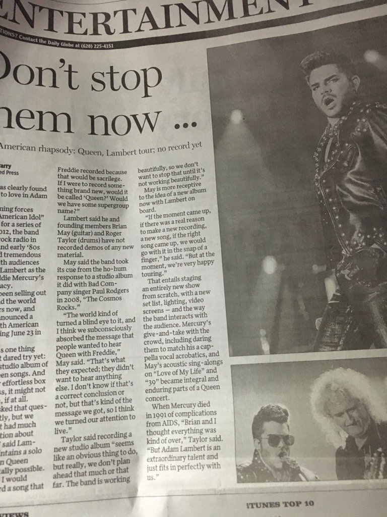Wow! This article ran today in the Dodge City, Kansas Daily Globe. @adamlambert @QueenWillRock