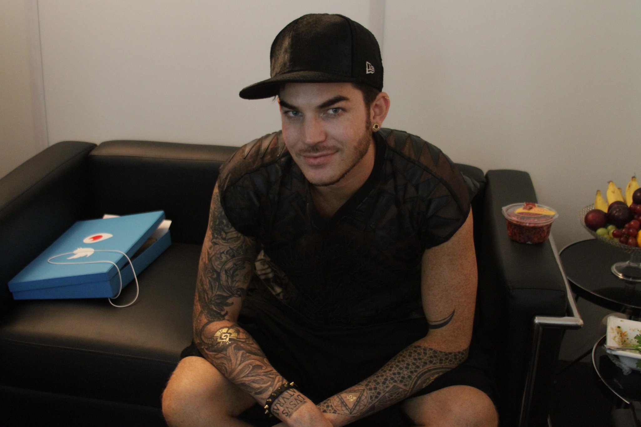 eta: he has some gold fake tats on his arms and sun dried tomatoes on the arm of the couch.